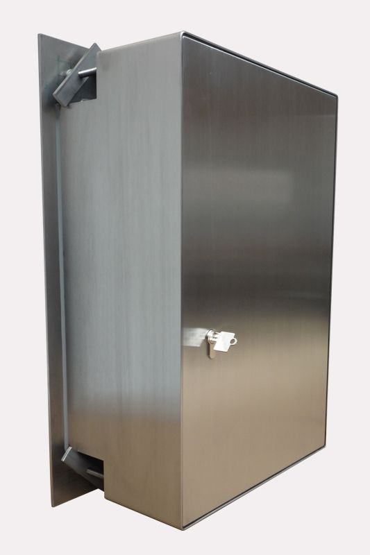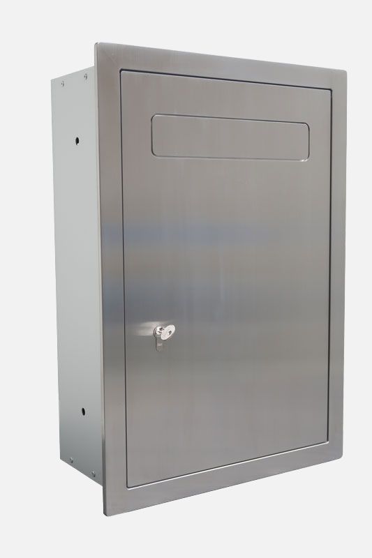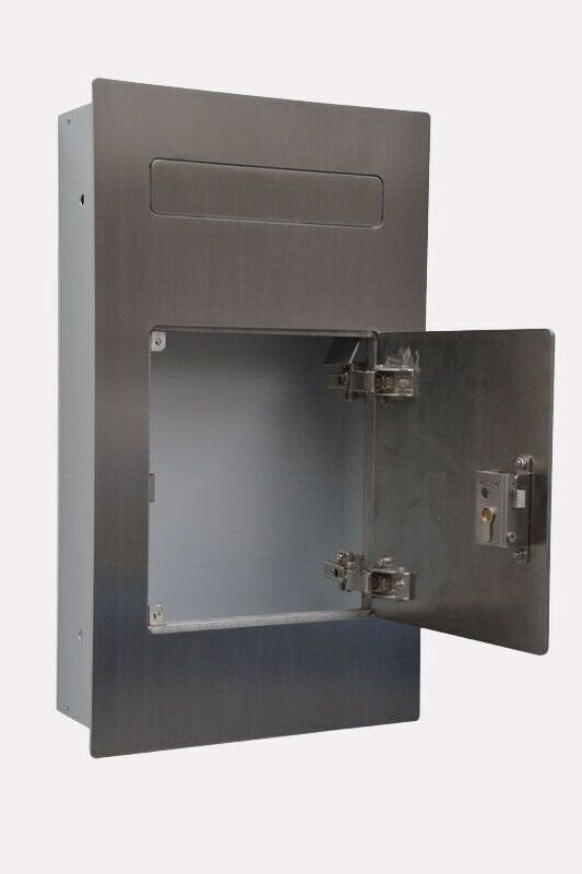 Sicher, hochwertig, robust – mit unseren Durchwurfkombi-Briefkästen zum Einbau in die Trockenwand treffen Sie die perfekte Wahl. Für Banken, Behörden und Gewerbe fertigen wir Sicherheitsbriefkästen nach Maß. Die flächenbündige Einwurfklappe lässt sich bezüglich der Öffnungsweite individuell einstellen. Darüber hinaus wird die Vorrichtung aus rostfreiem und langlebigem Edelstahl in die äußere Beplankung geklemmt. Die Front des Einbaubriefkastens wird mit der äußeren Beplankung der Trockenbauwand formschlüssig fixiert.