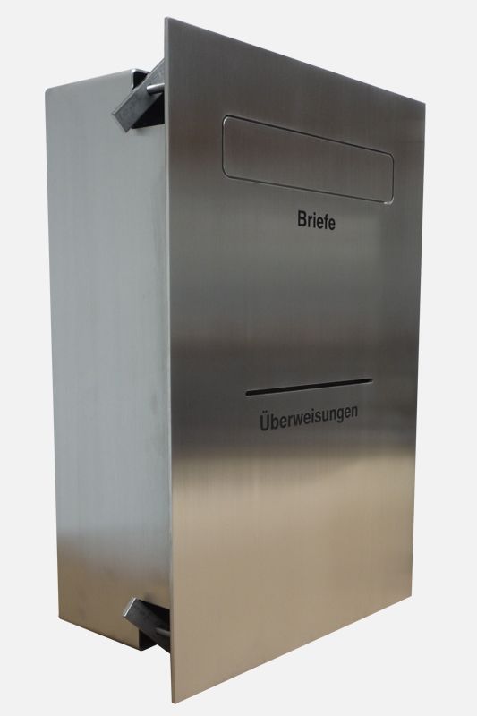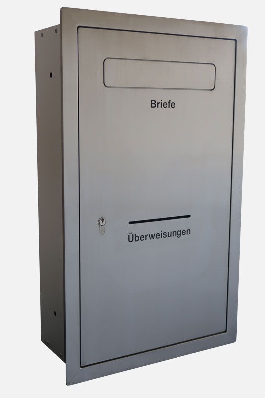 Eine weitere Option ist die getrennte Aufbewahrung von Post und Überweisungen. Dank des Doppelklapprechens ist eine Rückholung der Belege nahezu ausgeschlossen. Bei größeren Wandstärken ist der Durchwurfbriefkasten in der entsprechenden Tiefe als Sonderanfertigung realisierbar.